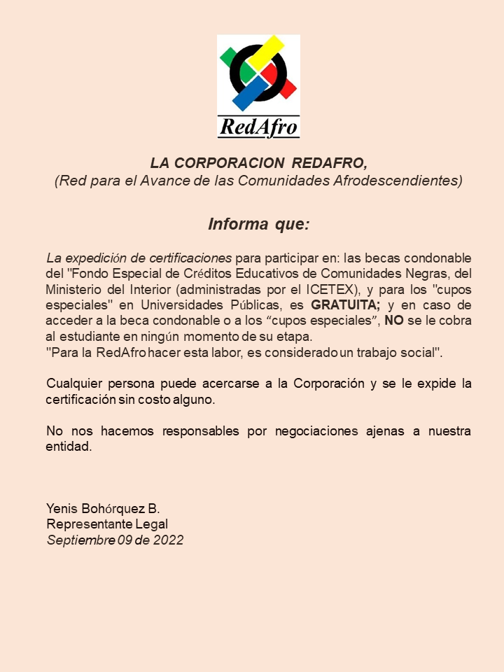 De otra parte de RedAfro, es un claro ejemplo de las organizaciones que han venido usando los medios de comunicación para una visualización adecuada de las condiciones de vida de las comunidades afrodescendientes, RedAfro ha usado el elemento noticioso como herramienta sensibilizadora al igual que el internet , medios impresos, folletos, publicaciones, etc. Gracias a estas estrategias, la temática afro es más conocida ahora que hace algunos años y si bien podemos decir que han obtenido algunos resultados positivos de esto, todavía estamos muy lejos de alcanzar la socialización de Esta temática frente a toda la Nación como es el deseo de la misma comunidad.